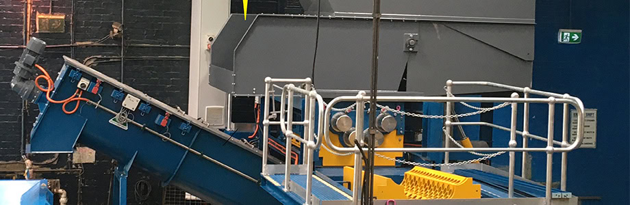 QS15WL Shredding Plant. A QS15WL 15kW Quad Shaft Shredder fitted with a removable screen mounted on an elevated frame. The unit is fed with a 600mm wide inclined belt conveyor.